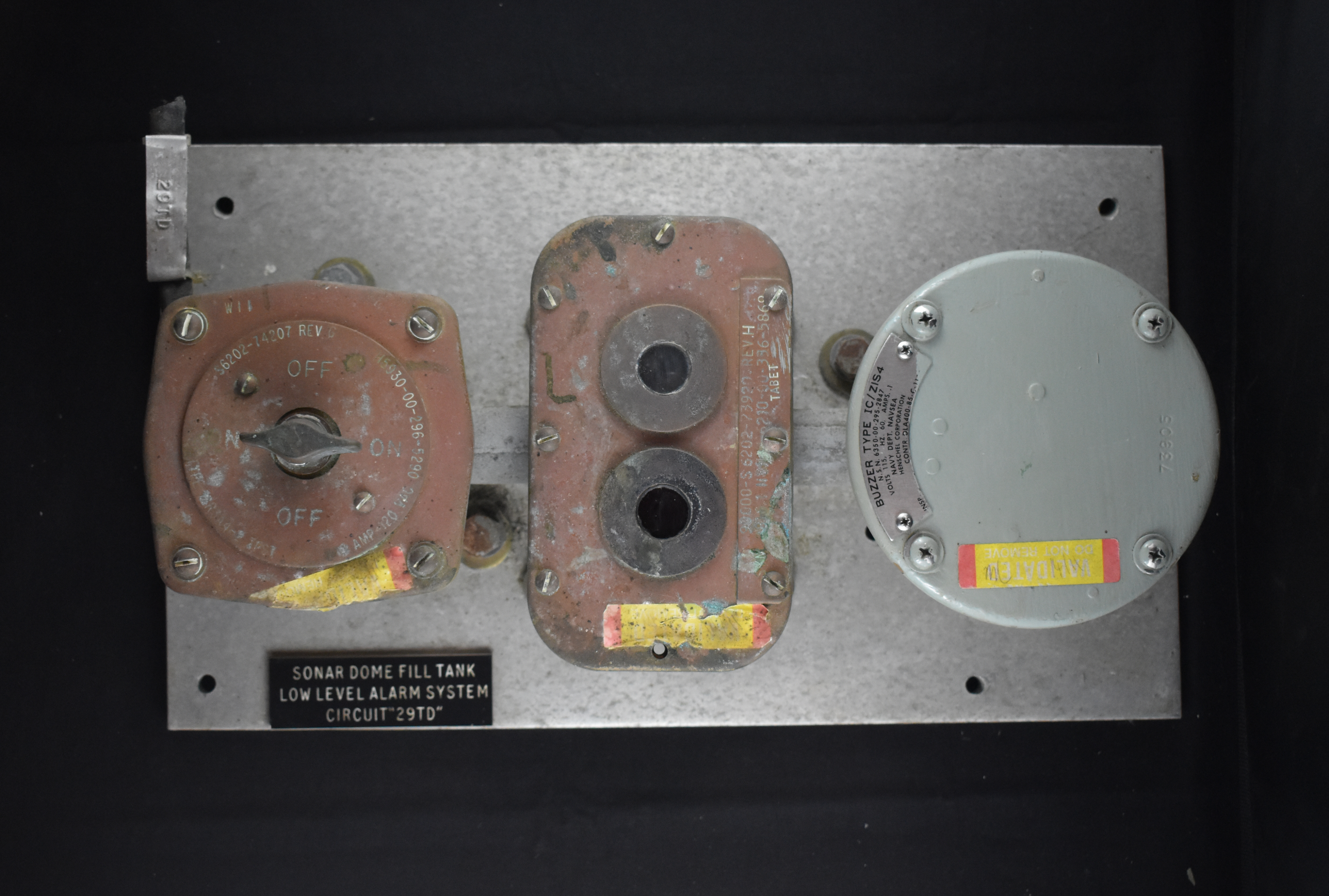 On front "SONAR DOME FILL TANK / LOW LEVEL ALARM SYSTEM / CIRCUIT "29TD"" on black plaque.