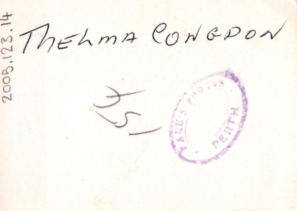Reverse: Handwritten in black pen 'THELMA CONGDON'. Stamped on the back with a purple oval stamp reading 'PARK'S PHOTO PERTH' and '154' written in pencil.