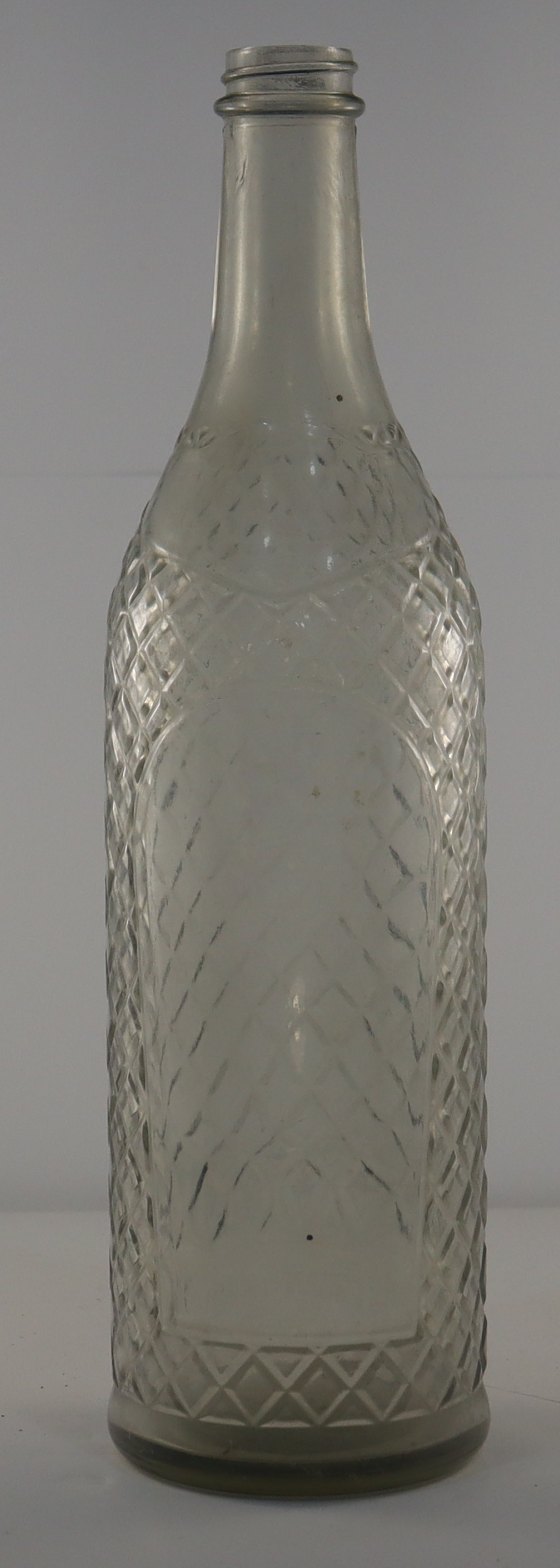 A clear bottle with an embossed diamond pattern all over the bottle except at the front where two labels can be glued to the bottle.
