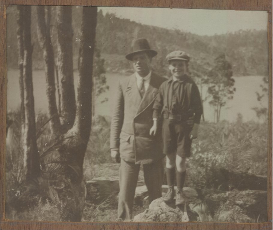 B/W print.William Bawden and his young brother, Kenneth. William is wearing a double breasted suit, shirt and tie, and felt hat. Kenneth is in a long-sleeved dark shirt, short pants with belt, boots with long socks and a cap. They are standing in the bush on the side of a river, Kenneth on a large rock and William beside him. A macrozamia and tree are next to them and several young gum trees behind them. In the background, the hilly bank of the river is covered with trees.