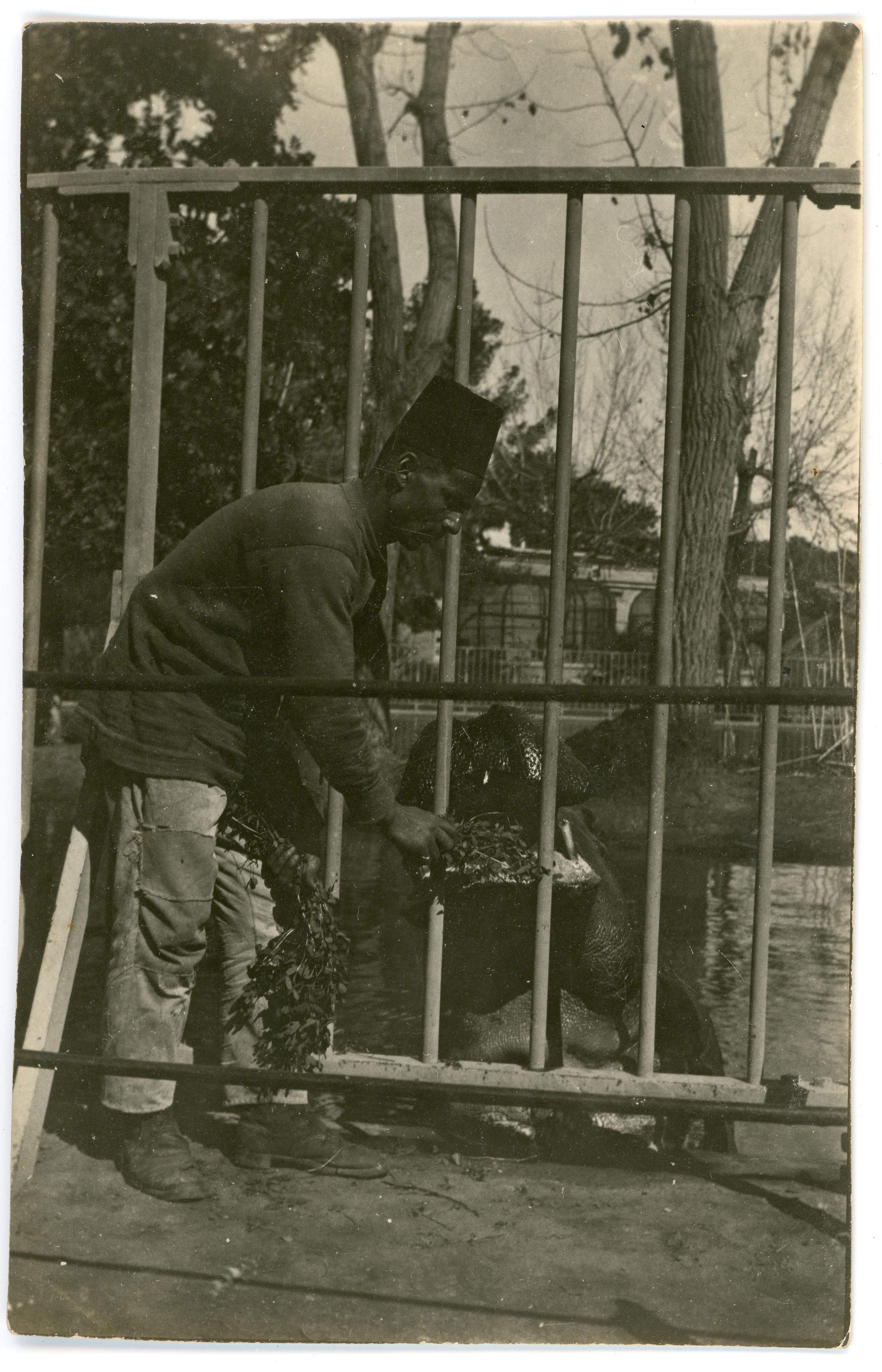 c. 1915Black and white photograph of a male zoo keeper hand feeding a hippopotamus through the enclosure bars at the Giza Zoological Gardens, Cairo.