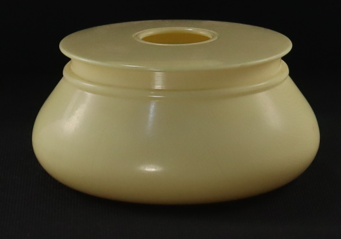 A circular pale yellow bowl with a lid which has a hole in the centre.