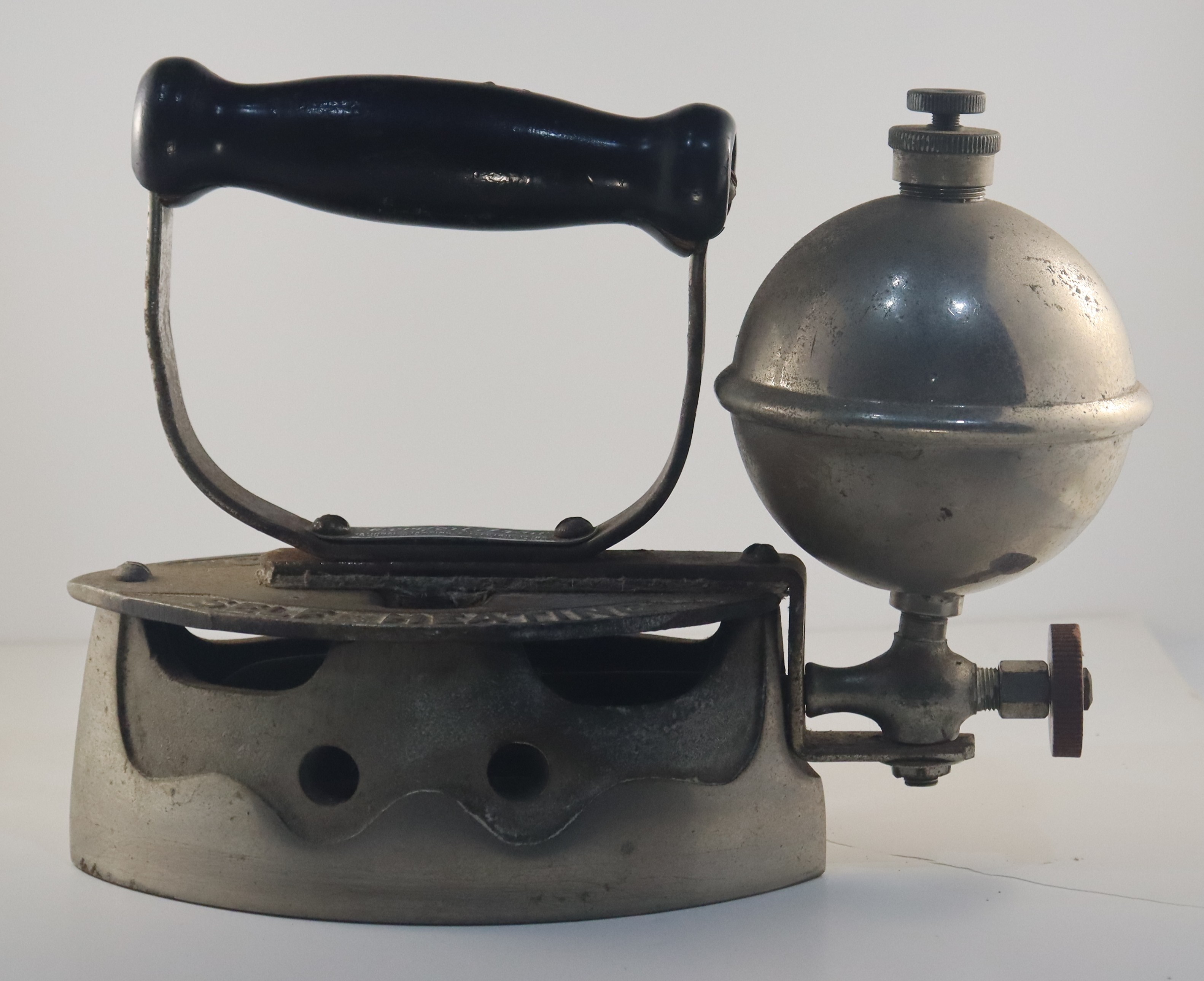 The knob on the top of the globe can be unscrewed and is where a flammable liquid was poured in. The knob below the globe controlled the amount of flammable liquid that went into the iron and was burnt..