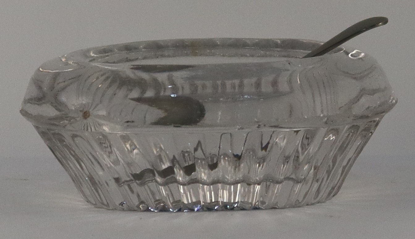 A moulded glass oval shaped dish, the top edge is thick but smooth, the sides are fluted, the base is pebbled.