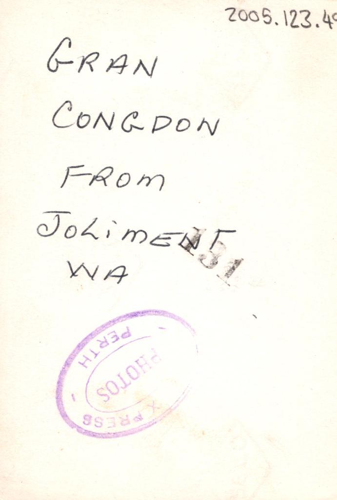 Reverse: Written in black pen is, 'GRAN CONGDON FROM JOLIMENT WA'. There is a purple stamp, 'X PRESS PHOTOS PERTH' and a black number stamped '131'.