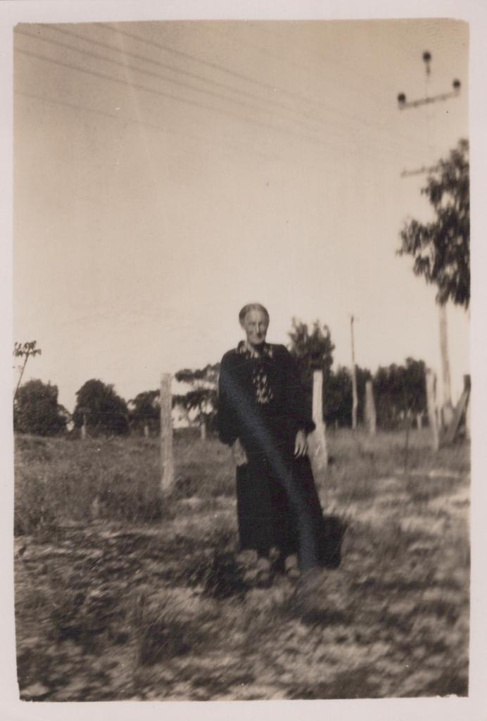 c. 1930Image: A photograph of what appears to be Annie Congdon standing on grass, infront of a wooden posted, wire fence. Annie wears a long black dress, with dark enclosed shoes. In the background is a powerline, and a few trees.