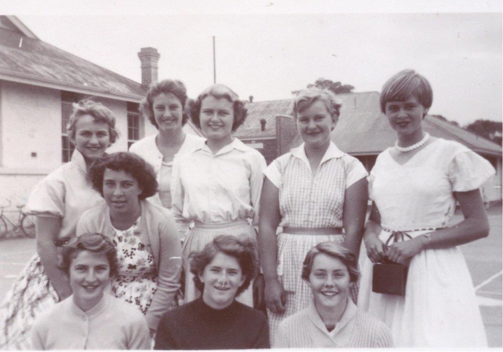 1956B/W Prints. (a) Fourteen third year high school boys posing in front of Claremont High School. Some are in front of the cyclone wire fence, two are sitting on the top rail and the rest are standing behind it. Several are 'mucking around' on what is believed to be their last day at the school. In the background are the road, a street tree and the two storey units at 83b Bay View Terrace. From L: Bernard Barrett, Fred or Len Carter, George Samuels, Peter White, Ron Alexander, Richard Cherry, Ross Wilkie, Bob Locke, John Brearley, Bruce Tassell, John Johnson, George Macrides, Vincent Marelich. (b) Nine third year high school girls are grouped on the bitumen playground. All are dressed in summer outfits. In the background are the old, stone physics room and the1950s extensions. Students include Back L: Sandra Sandercock, Geraldine Williams, Kay Minchin, Anne Logie, Helen Connett. Centre L: Wendy Bartholomew. Front L: Andrea Vetter, Norma Coe, Gaye Turton.