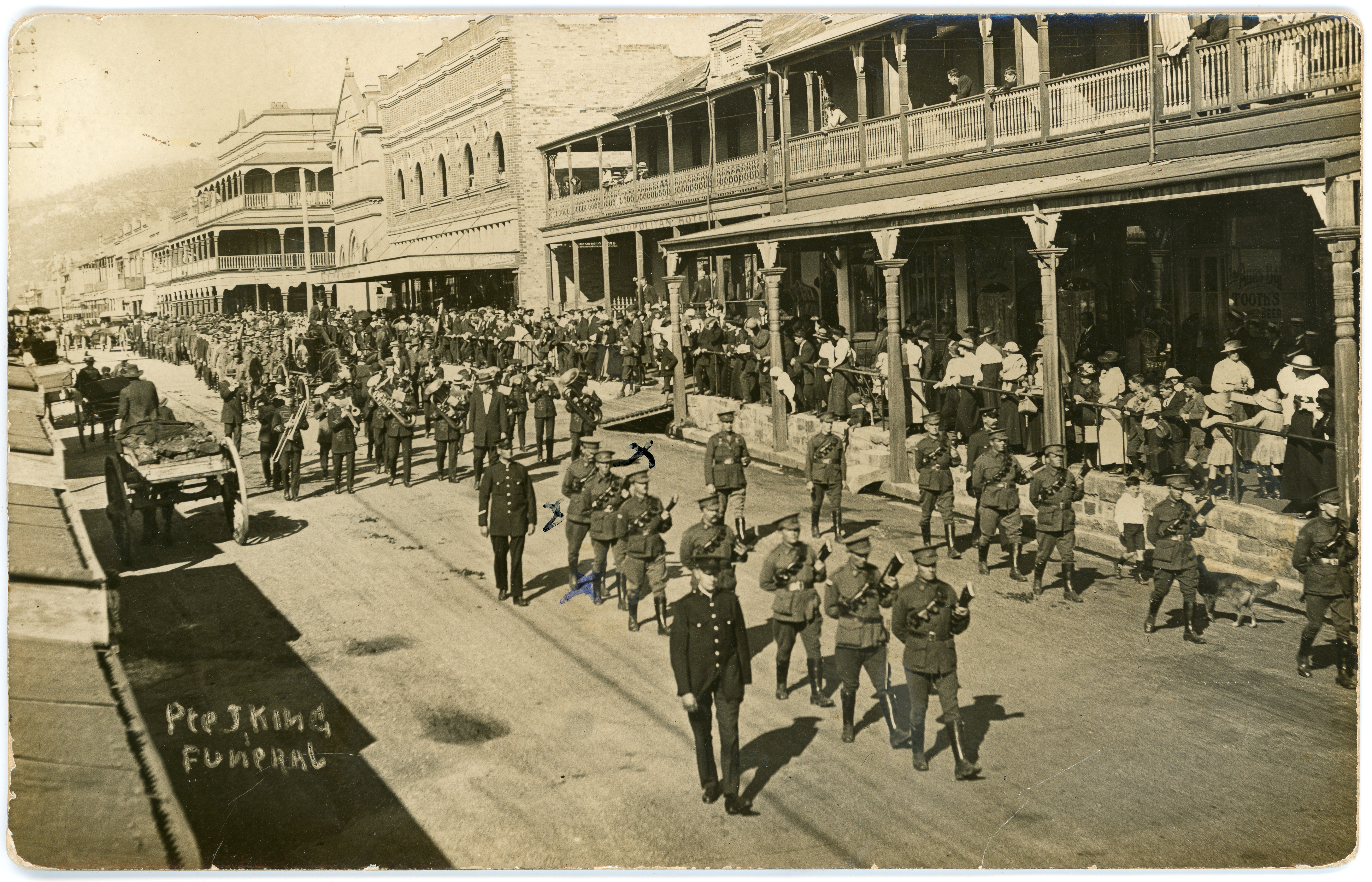 1917Black & white photographic postcard showing the funeral of Pte. Joseph Peter KING, 523; soldiers can be seen marching down Main Street Lithgow, with large crowd of civilians watching on. Buildings on left include the Grand Central Hotel and the Cosmopolitan Hotel.