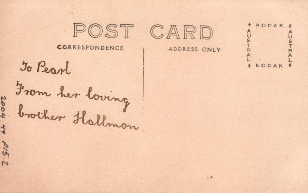 Reverse: Written in black pen 'To Pearl from her loving brother Hallmon'