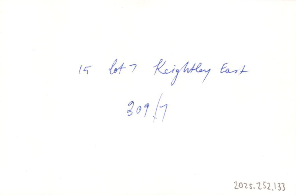 Reverse: Written on the reverse in blue pen '15 (lot 7) Keightley East' and '309/7.'
