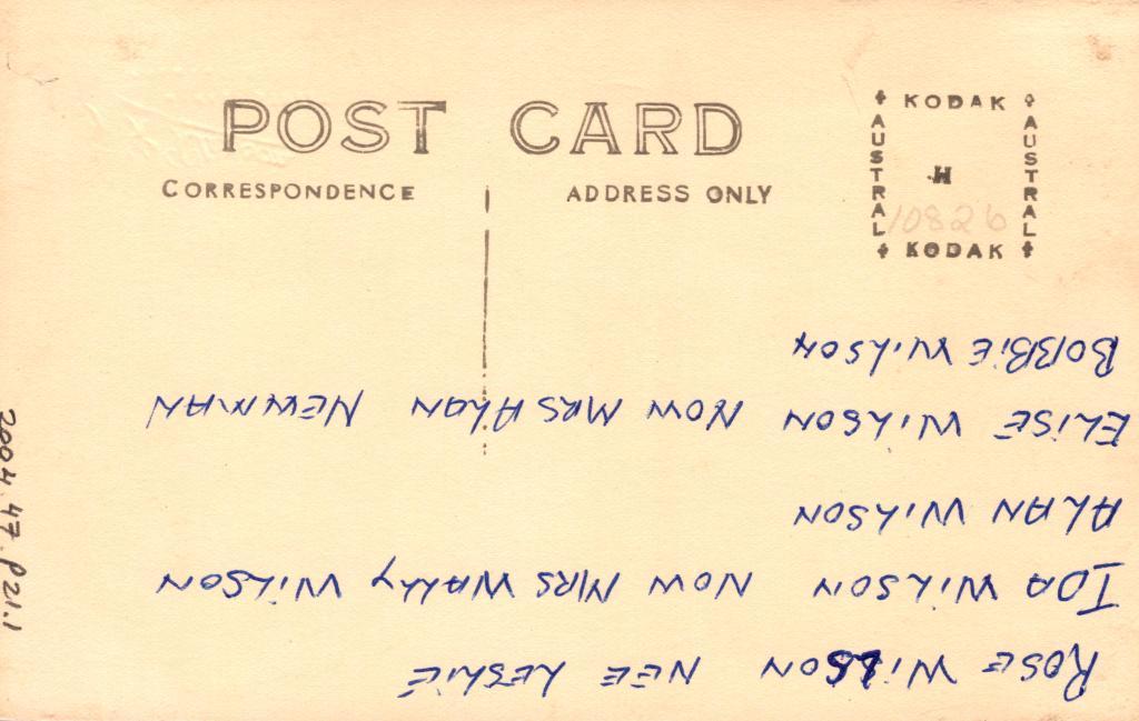 Reverse: Written in blue pen 'ROSE WILSON NEE LESLIE', 'IDA WILSON NOW MRS WALLY WILSON', 'ALAN WILSON', 'ELISE WILSON NOW MRS ALAN NEWMAN' and 'BOBBIE WILSON'
