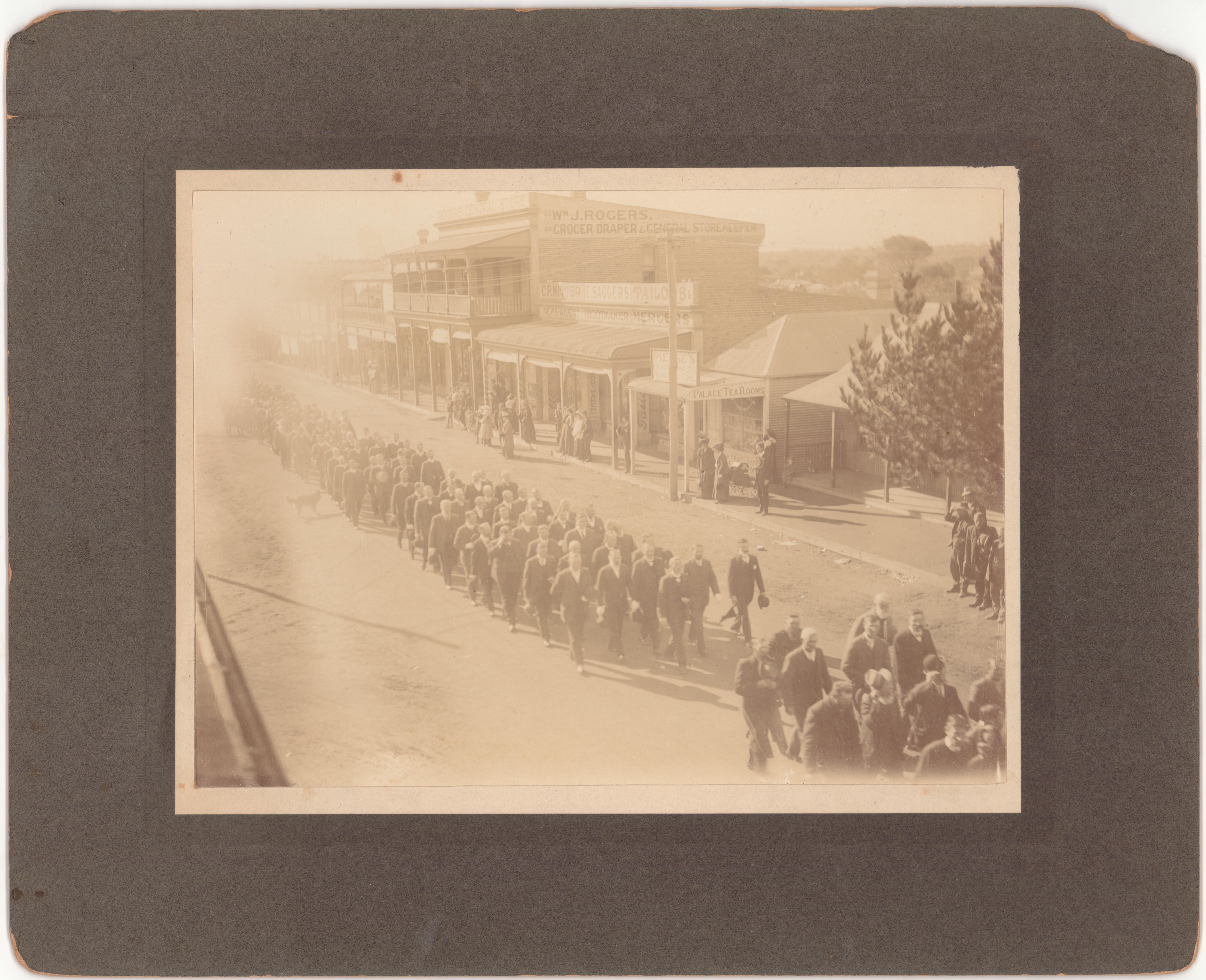 1912A sepia photograph of approximately twenty rows of men dressed in suits and four abreast marching ahead of a funeral cortege. In the background are people lining the street. The shop fronts that are visible in the background are "W.J. ROGERS" and the "Palace Tearooms'