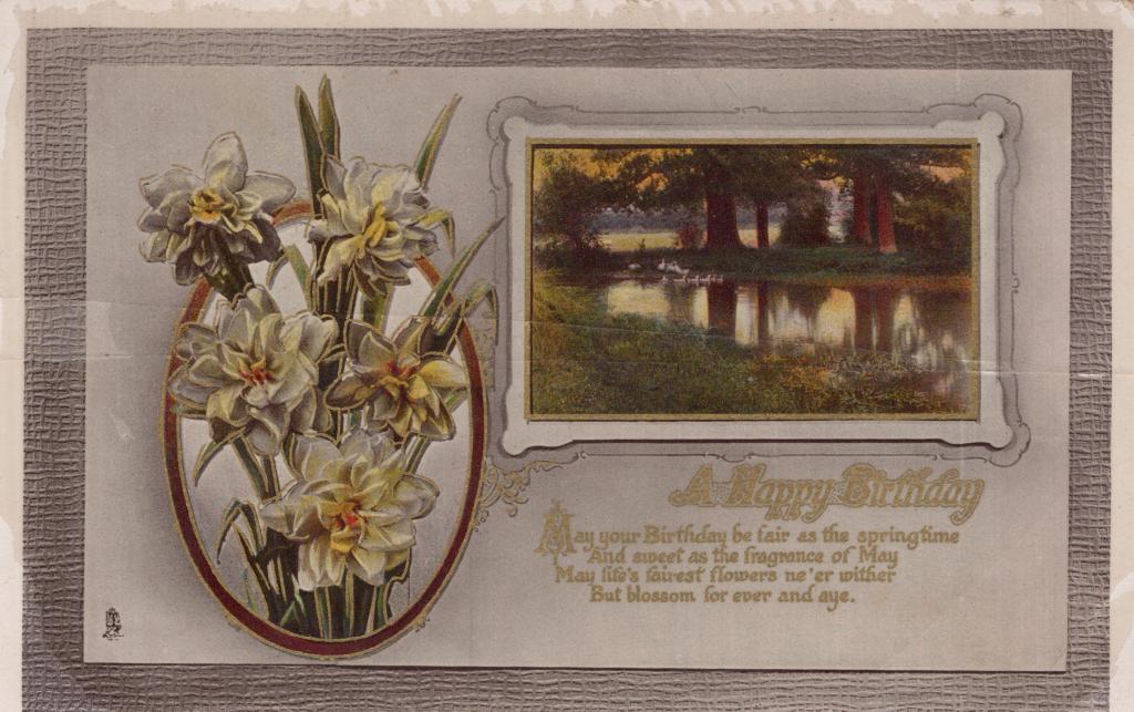 c. 1913Postcard showing a decorated birthday card. There is a landscape scene seen on the card. Flowers are also seen. The text 'A Happy Birthday' and 'May your Birthday be fair as the springtime And sweet as the fragnance of May May life's fairest flowers ne'er witfier But blossom for ever and aye.' is seen on the card.