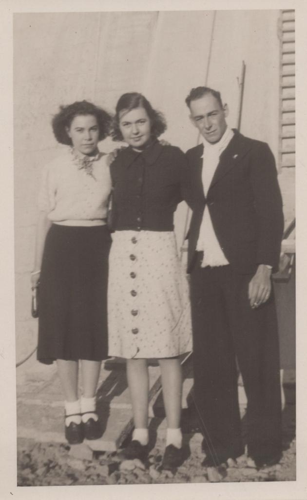 c. 1930Image: A photograph of Rose Green (left), Thelma Congdon (centre), and Ern Green (right), standing on what appears to be stones/pebbles, with their arms around eachother. Rose wears a light-coloured top, with a neck-scarf, a long black skirt, white socks and black enclosed shoes. Thelma is wearing a black button-down shirt, with a light buttoned skirt, white socks and dark enclosed shoes. Ern wears a white dress shirt, a dark jacket with the middle button done up, long dark pants, and dark enclosed shoes.