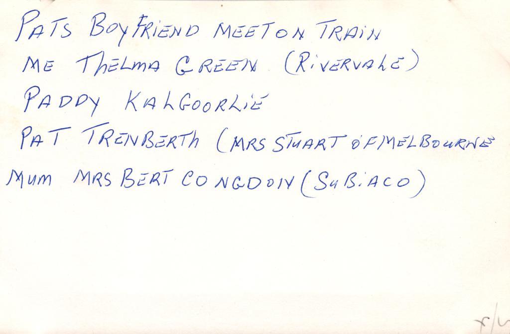 Reverse: Written in blue pen, 'PATS BOYFRIEND MEETS ON TRAIN', 'ME THELMA GREEN (RIVERVALE)', 'PADDY KALGOORLIE', 'PAT TRENBERTH (MRS STUART OF MELBOURNE)', 'MUM MRS BERT CONGDON (SUBIACO)'