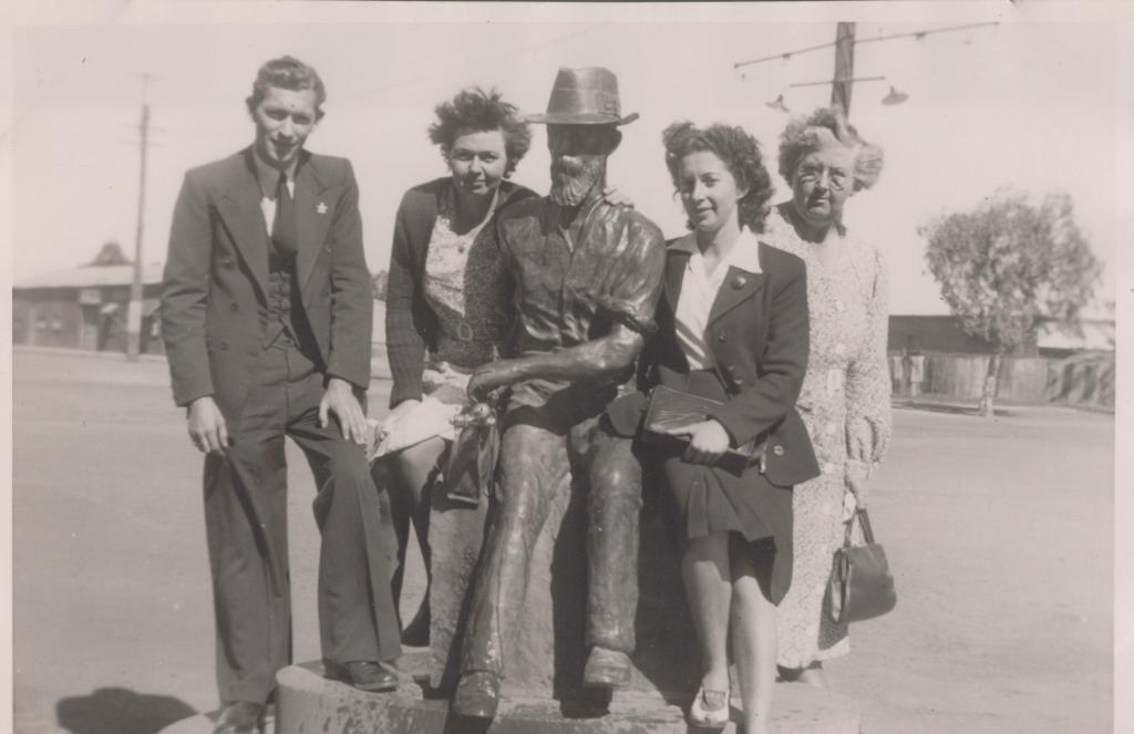 c. 1930Image: A photograph of Paddy Hannan (left), Thelma Green (centre left), Pat Trenberth (centre right) and Pearl Congdon (right). The group is posed either side of what appears to be a brass statue, each with a foot resting on the base of the statue. Paddy wears a dark colored suit, with a white dress shirt, and a pin on the lapel. Thelma wears a short floral dress, with a belt, and a dark colored cardigan. Pat is wearing a white dress shirts with a dark jacket ontop, a dark coloured skirt, and a leather purse in her one hand. Pearl wears a light coloured, long sleeve, floral dress, and holds a leather handbag in her one hand. Behind them appears to be a street, a tree to their right, along with a powerline behind them.