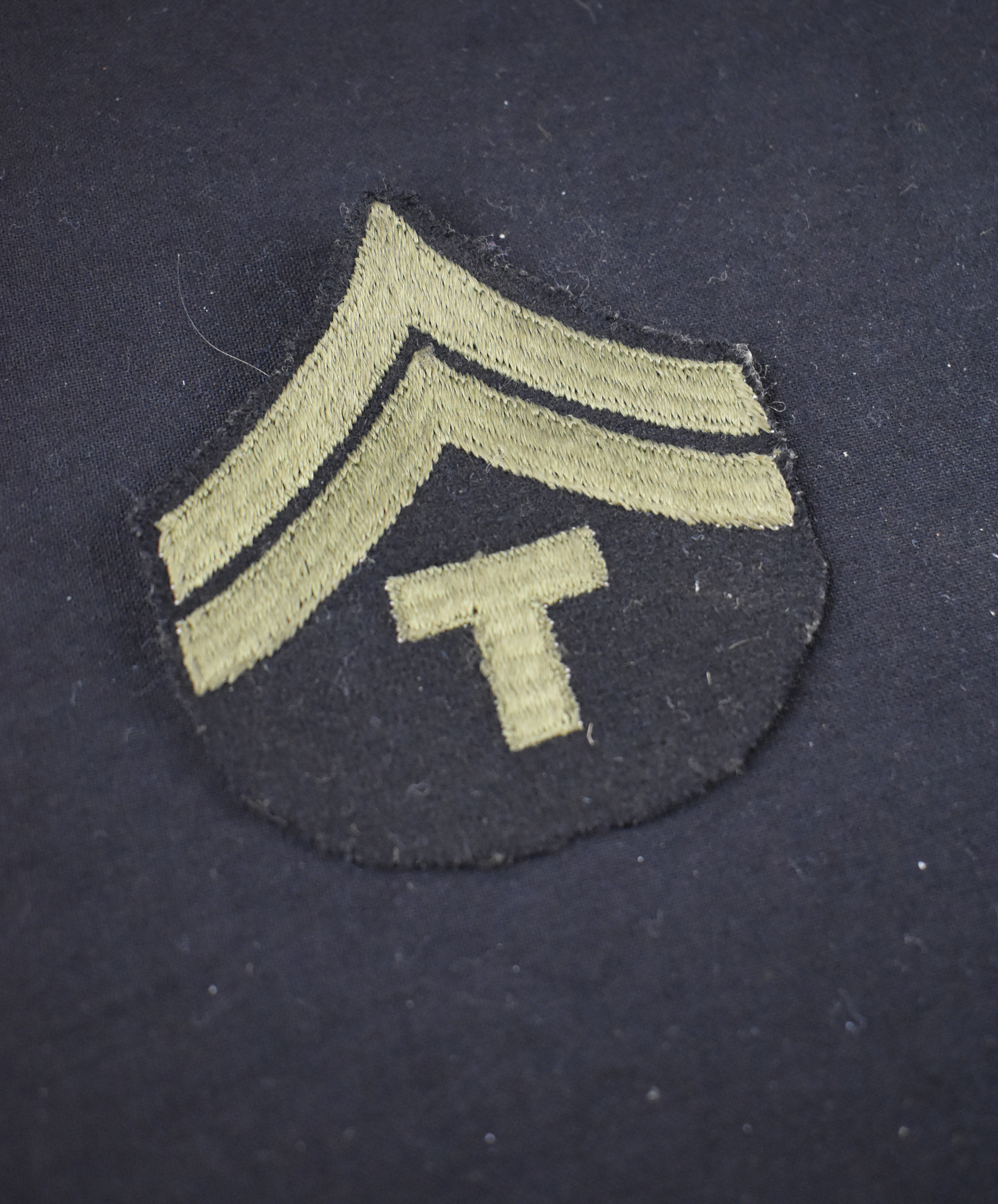 1942 - 1948A black cloth patch with olive thread embroidery of two (2) chevrons signifying the rank of Corporal with an embroidered letter “T”, signifying that the wearer had ‘special’ technical skills.