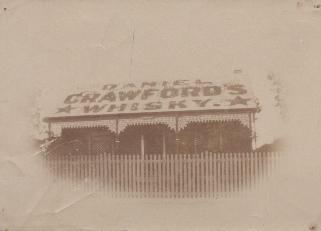 c. 1920Sepia photograph of 'DANIEL/CRAWFORD'S/*WHISKY*' business. There is an oval shape so only the edge of the trees can be seen.