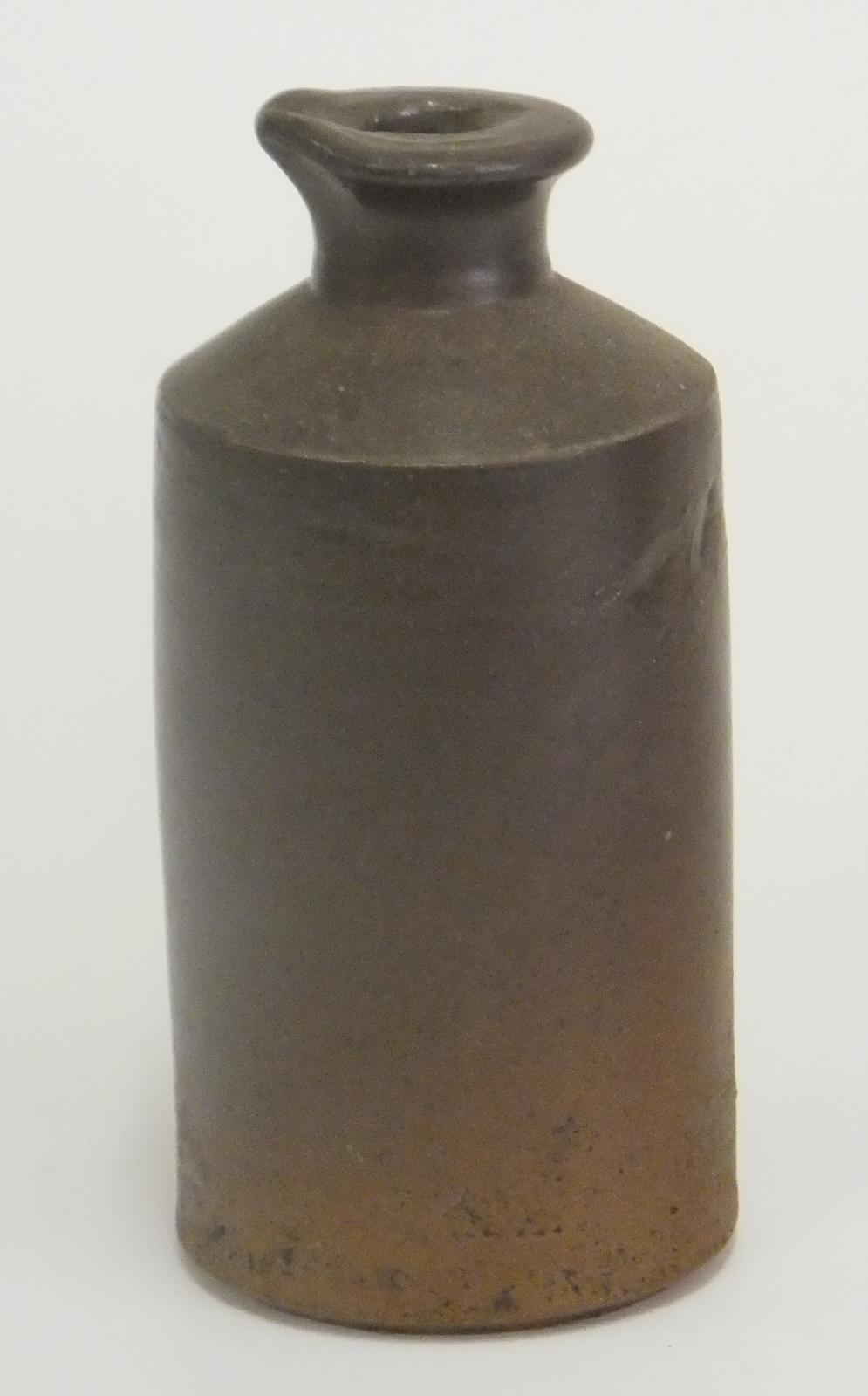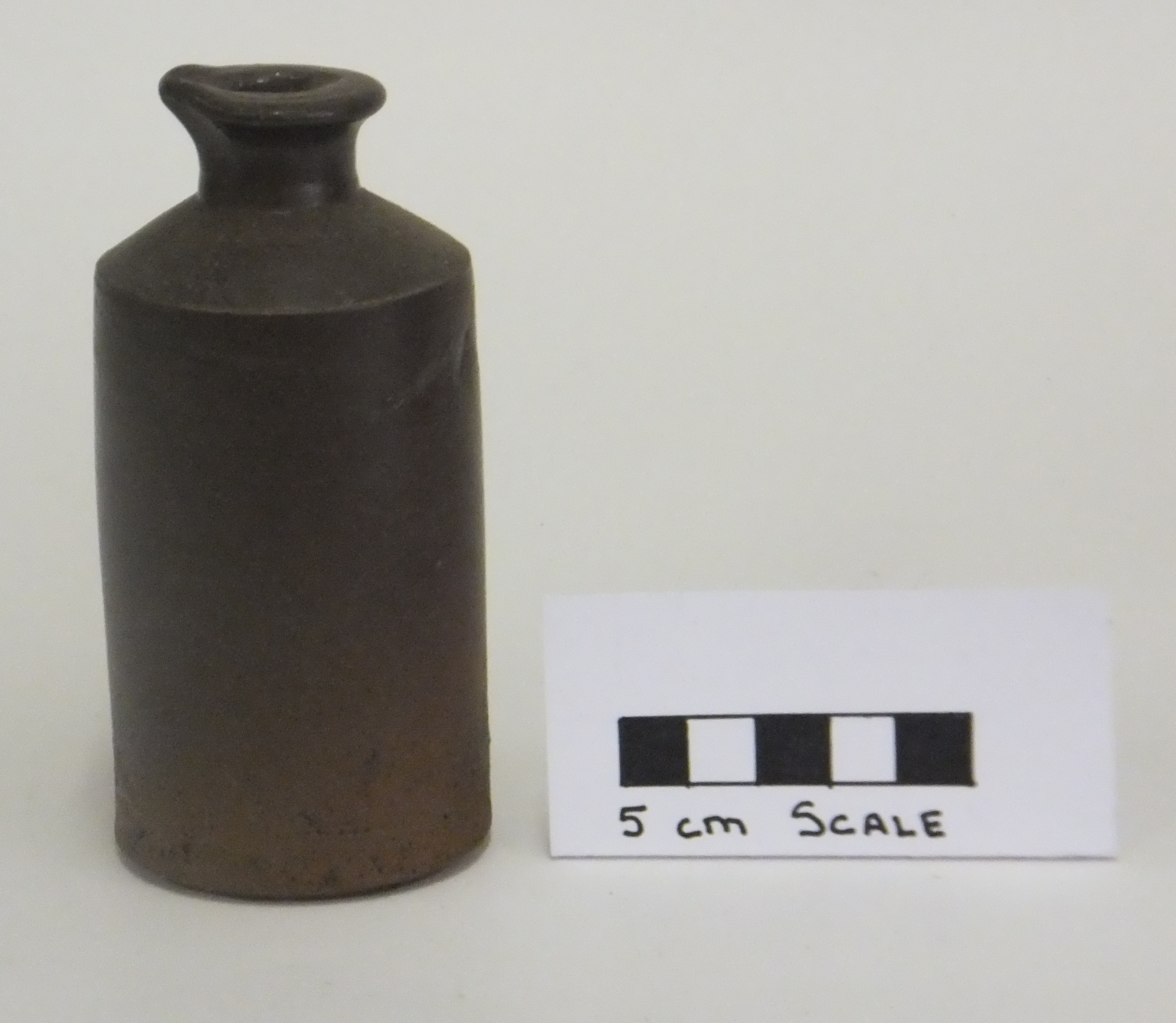 A brown stone ink bottle with a pouring lip. Donated by Mrs Zadow of "Muradup Farm" where it was used in the early days.