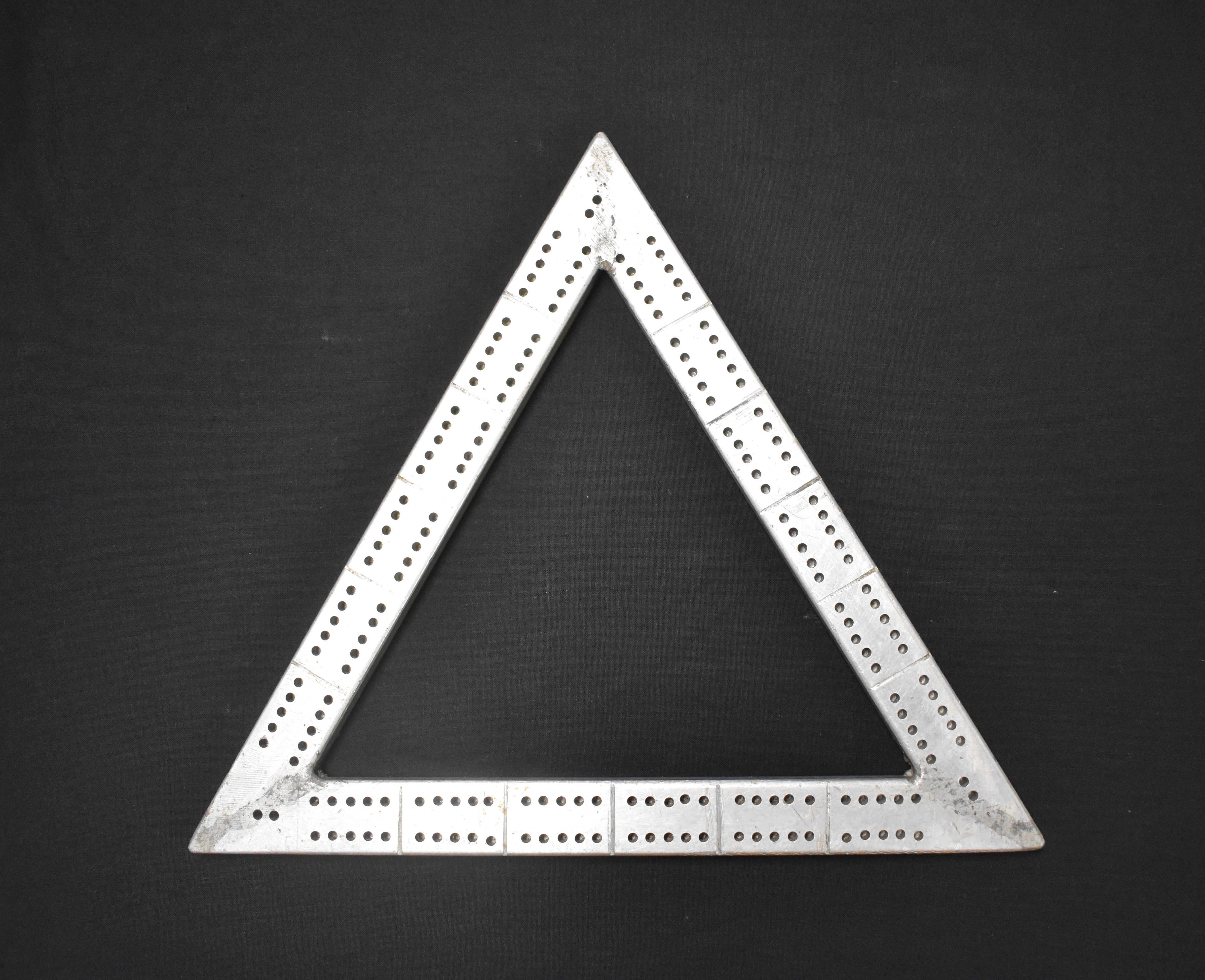 c. 1990Aluminium triangle with with two row of sixty (60) holes on all three (3) side. It doesn't have extra two (2) pegging-out holes to count games.