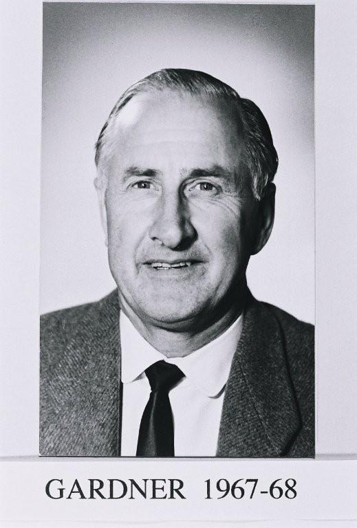 1967 - 19681 x B/W Portrait photographic print of George A Gardner CR. Image shows an older man with slicked back greying hair. He has a light dusting of stubble evident on his face. He appears to be smiling, wearing a thick wool blend jacket, with a white collared shirt and dark tie. Printed beneath [GARDNER 1967-68].