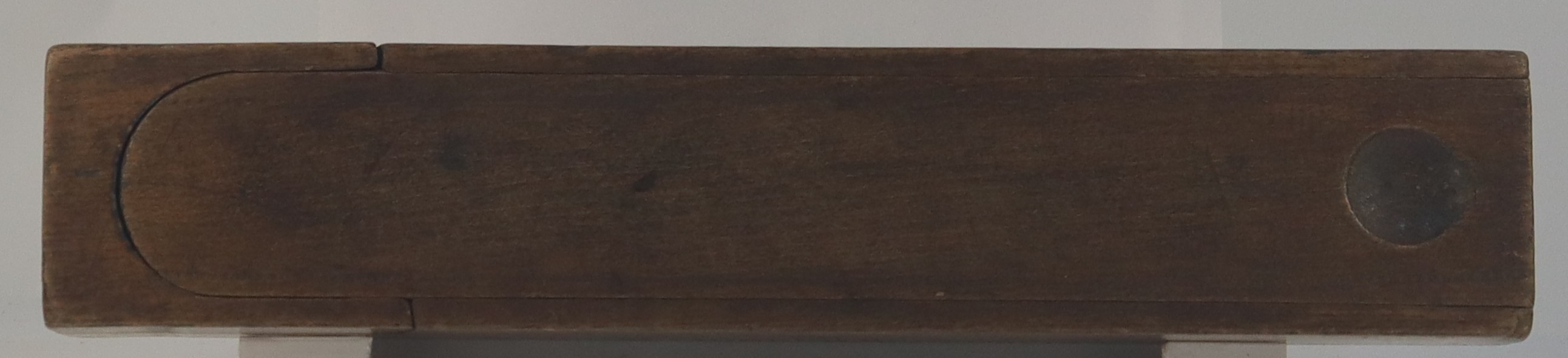 c. 1950A wooden two level pencil case. It has a sliding lid, and the top level swings out.
