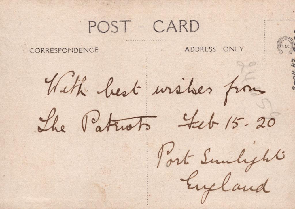 Reverse: Written in black pen 'With best wishes from the Patriots feb 15-20 Point Sunlight England'