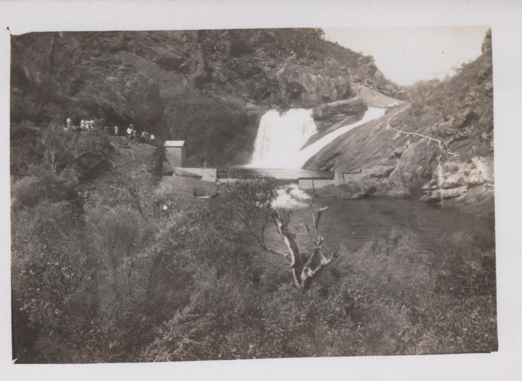 c. 1910Image: A black and white landscape photograph of Serpentine Falls, with bushland in the foreground. On the lefthand side of the falls, there are numerous people standing ontop of a rock.