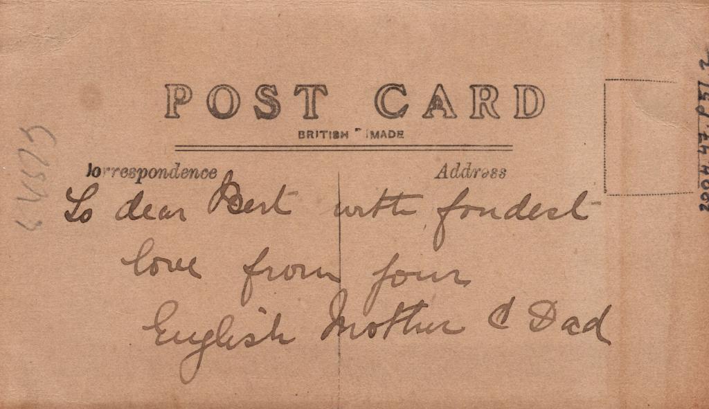 Reverse: Written in black pen 'To dear Bert with fondest love from your English (?) mother & Dad'