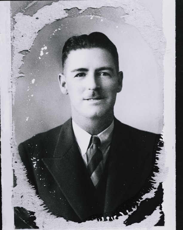 1938 - 19391 X B/W bust photographic portrait print of Cyril Augustus Frank. Image depicts a younger man, with dark brushed back hair and a light dusting of hair on his top lip. He appears to be smiling. He is wearing a dark jacket with wide lapels, a white collared shirt and a large soft diagonally striped tie.