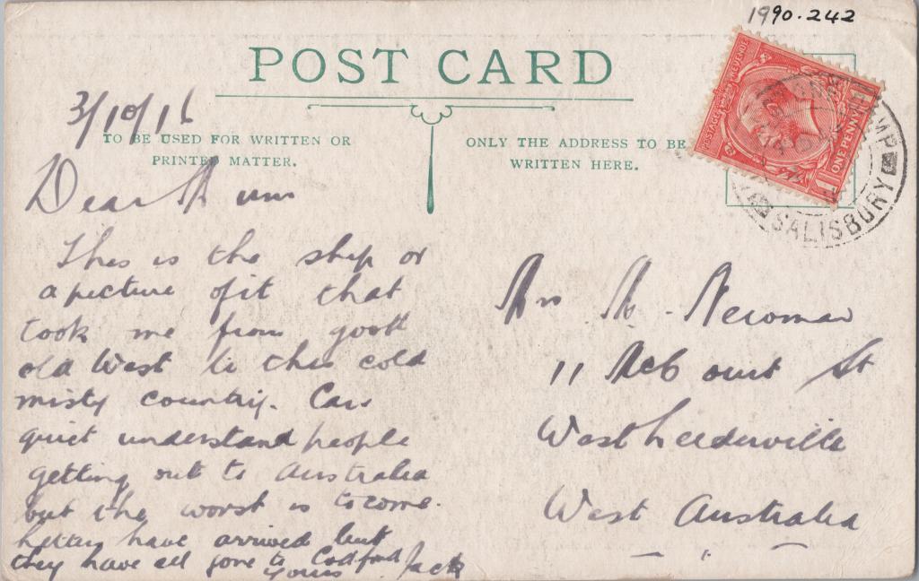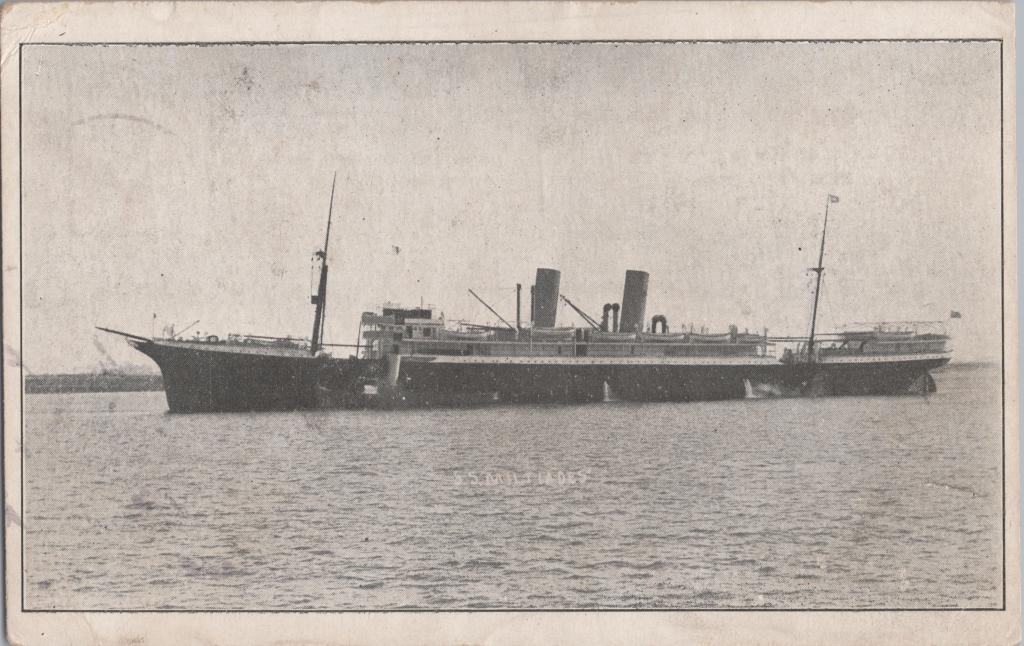 1916Black and white postcard with white border of the SS Miltiades, from Jack Newman addressed to his mother, Mary Newman.