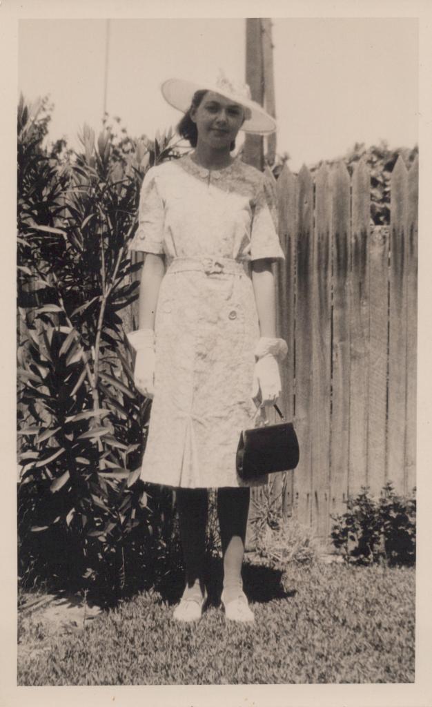 c. 1930Image: A photograph of Thelma Congdon standing on grass, infront of a small tree and a wooden fence. She is wearing a white blouse, with lace texturing on the front, white gloves, and a white hat, holding a black purse in her hands, and wearing light enclosed shoes.