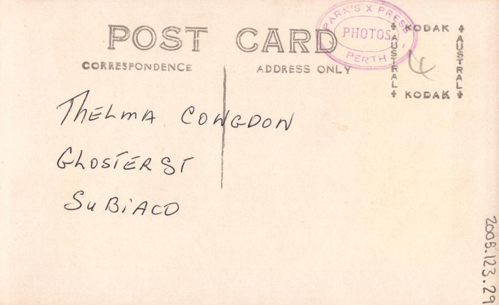 Reverse: Handwritten in black pen is 'THELMA CONGDON', 'GLOSTER ST', 'SUBIACO'. There is a purple stamp, 'PARK'S X PRESS PHOTOS PERTH'.