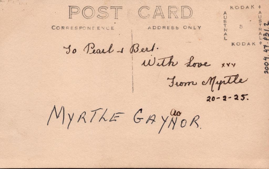 Reverse: Written in black pen 'To Peark & Bert. With love xxx From Myrtle 20-2-25'