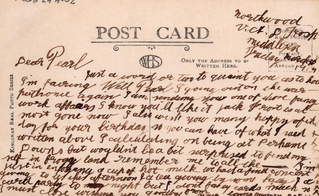 Reverse: Written in black pen is text starting with 'Dear Pearl'