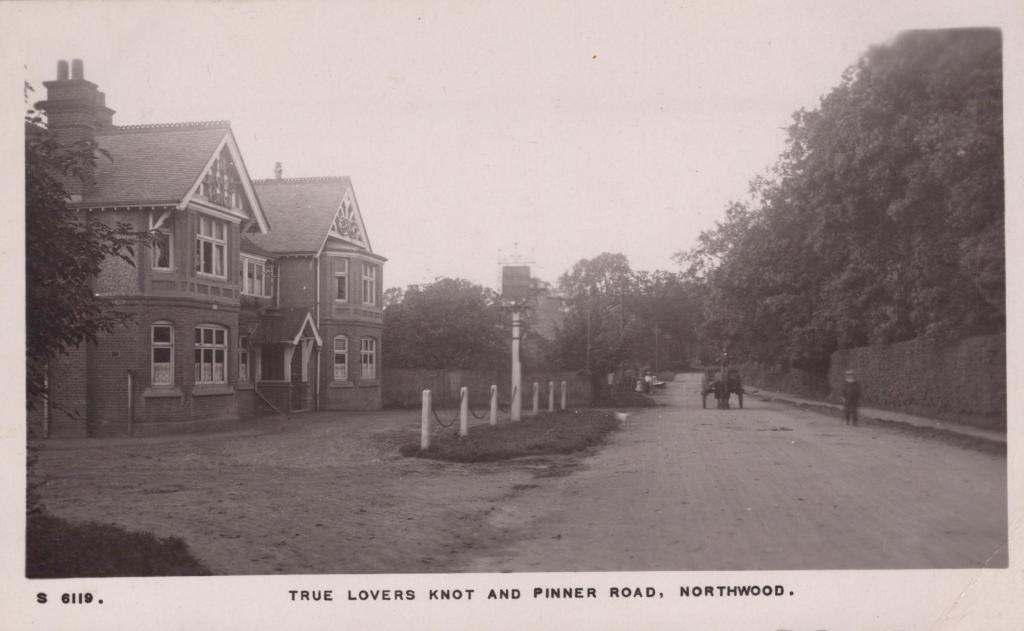 c. 1913Postcard showing an unknown street which could be Pinner Road, Northwood. The text 'TRUE LOVERS KNOW AND PINNER ROAD, NORTHWOOD' is seen beneath the image. Houses are seen to the left in the image and trees are seen to the right. A road is seen in the middle.