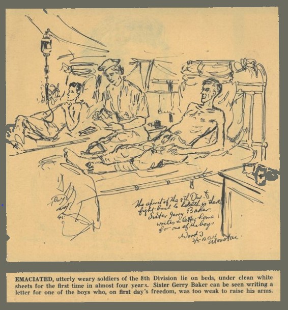 Newspaper copy of pencil sketch of Sister Gerry Baker writing letter for recently released prisoner of war.