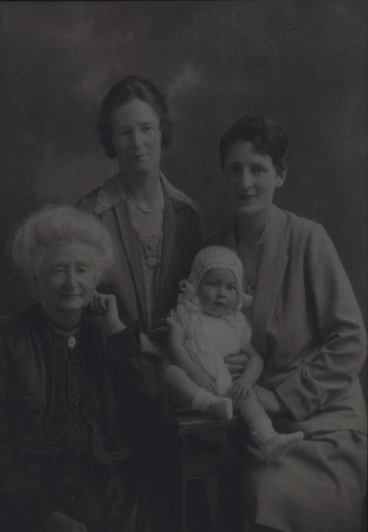 B/W studio photo. Mary-Anne Porter, a white- haired lady in a black, long-sleeved frock with pendant attached to a black ribbon, is sitting with her hand to her face and her elbow on a small table. Her daughter Ruth Jane Efford (nee Porter) is standing at the back. She has short dark hair and is wearing a jacket with collar and long revers, necklace and brooch. Seated beside her is her daughter Ivy Robson (nee Efford) with short dark hair swept to one side. She is wearing a skirt and loose-fitting, long- sleeved jacket with revers and is holding baby Sylvia on a small table. Sylvia Robson, a chubby-faced baby, is wearing a white short-sleeved frock, white bonnet and white booties.