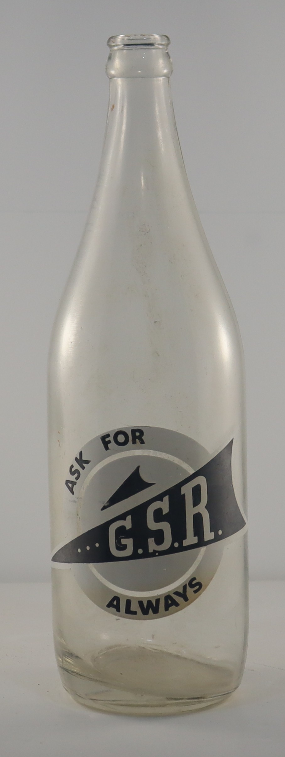 On the back of the bottle stamped in white lettering is "THIS BOTTLE ALWAYS REMAINS THE PROPERTY OF G.S.R. MINERAL WATER CO.PTY. LTD. KATANNING ALBANY NARROGIN BUSSELTON ARTICICIALLY COLOURED PRESERVATIVE ADDED".