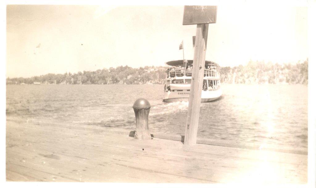 c. 1940 - 1949B/W copies (a) The ferry Emerald tied up at the Claremont Jetty. A blind on the side of the lower deck is partly rolled and there is a flag at the rear. There are people on the upper and lower decks. A man in shorts is walking out the jetty. (b) The Emerald crowded with people leaving the western side of the Claremont Jetty. The jetty is in the foreground with a bollard and sign post, and the Peppermint Grove foreshore in the background.