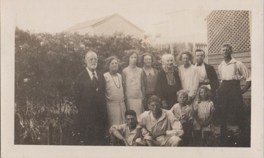 Black and white photograph of members of the Lake family in the back garden of their Cottesloe home.