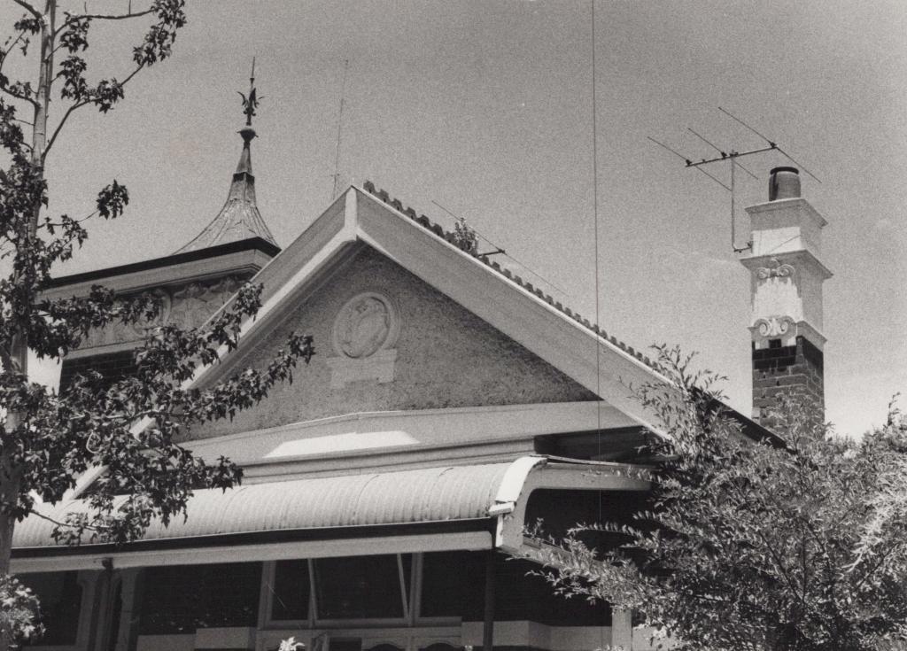1985Black and white photograph of a house at 135 Hamersley Road. There is a gable with a architectural ornament on the wall beneath the gable. There is a brick chimney to the right. The chimney is decorated with an architectural ornament. There is an electrical antenna attached to the chimney. There is a small spire to the left. There is a bull nosed verandah with a tin roof. There are some trees on each side in the image.