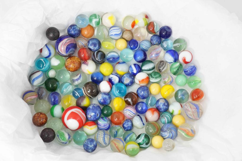 c. 1900Collections of marbles - Three Tom Bowlers and 73 assorted size and colour. (The marbles were displayed with "John Bull" oats bag which is unnumbered.) Note: It is thought that the marbles were donated in the Rolled Oats bag (1987.131.2). Rolled Oats were made into porridge, a popular breakfast food.