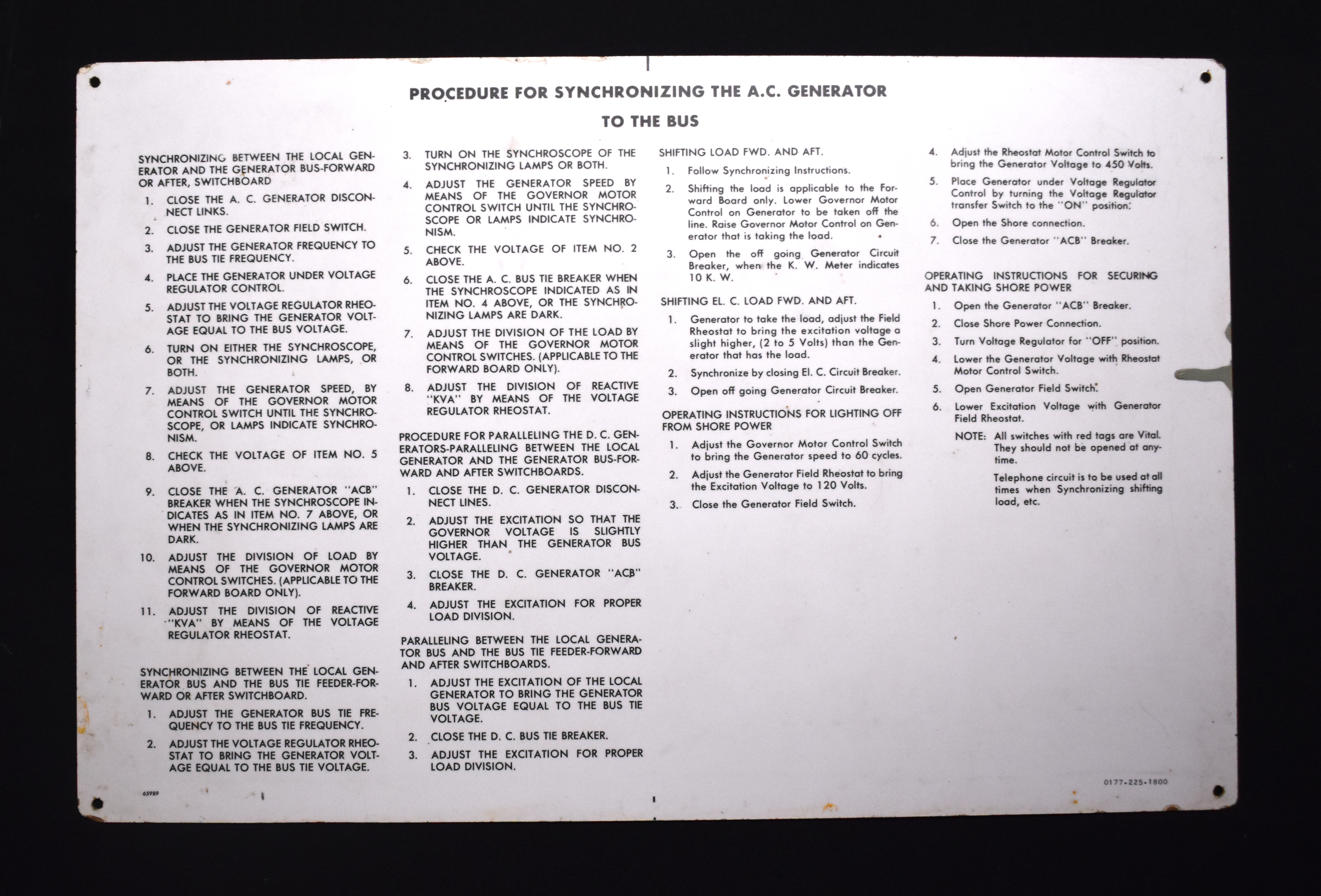 HMAS Perth II A.C. Generator Procedure Sign