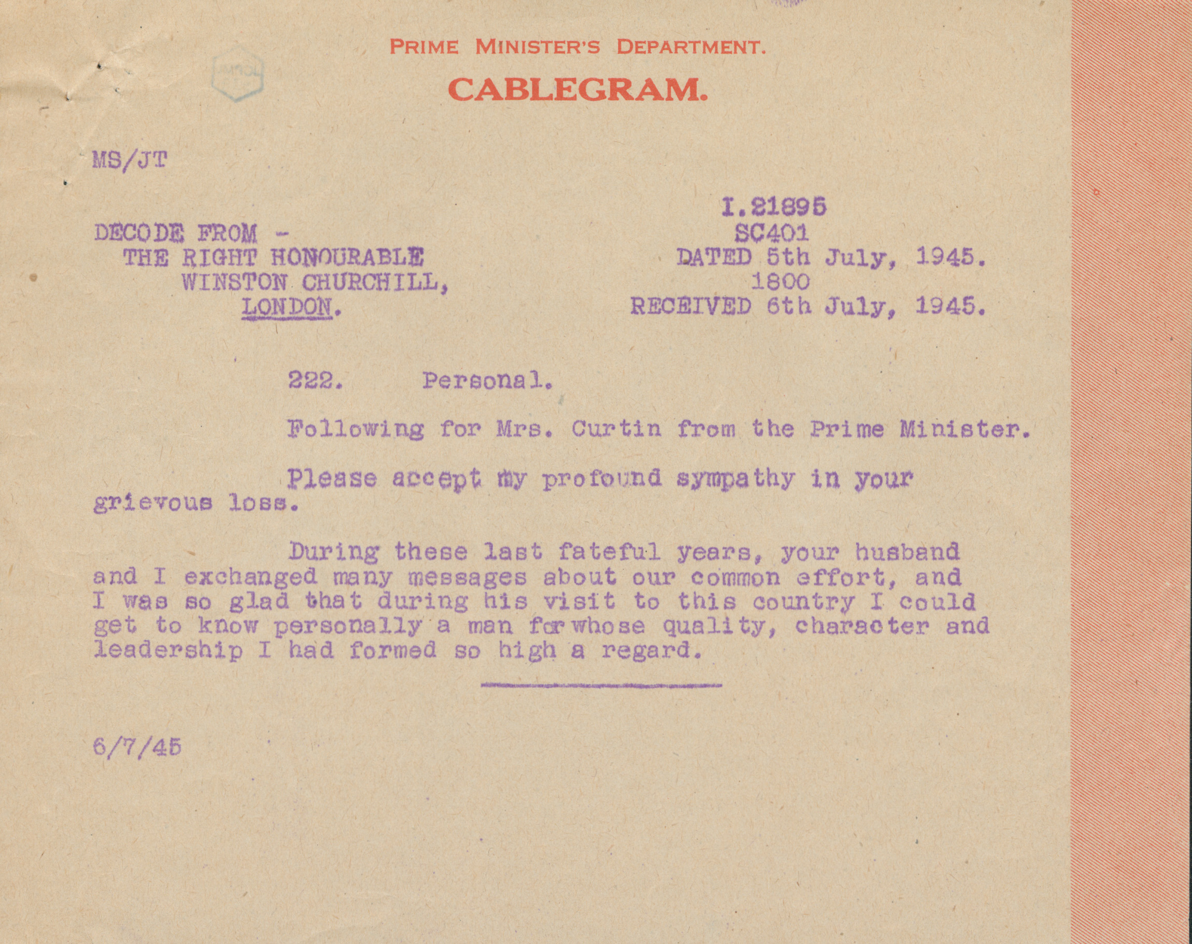 'Please accept my profound sympathy for your grievous loss. During these last fateful years, your husband and I exchanged many messages about our common effort, and I was so glad that during his visit to this country I could get to know personally a man for whose quality, character and leadership I had formed so high a regard.'