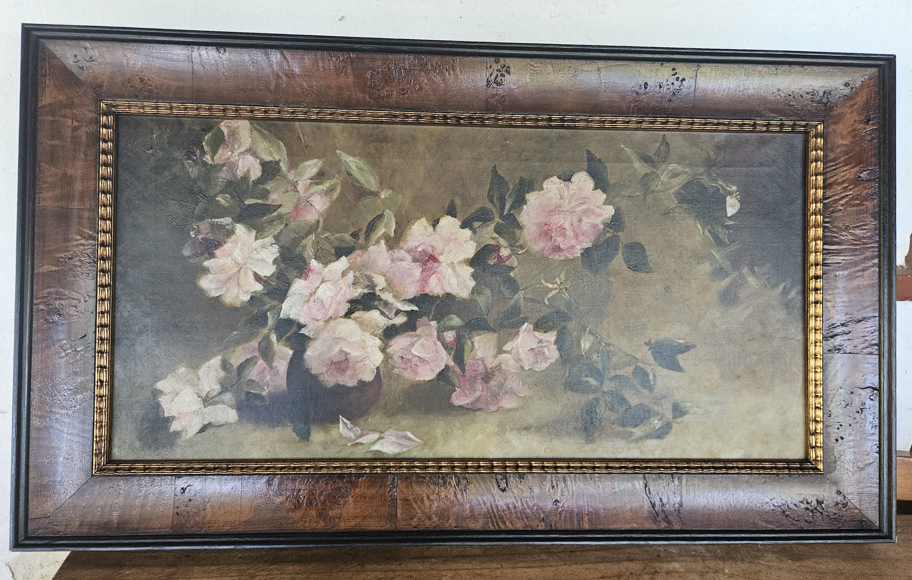 c. 1920oil painting on canvas of pink roses. Timber frame with gold edging.