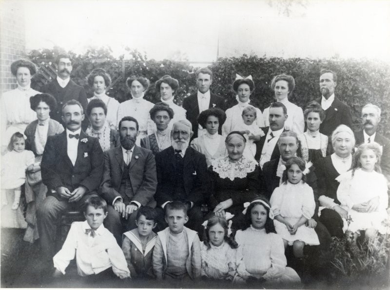 1912B/W print. Framed group photo of the Efford family taken beside a brick wall and in front of a creeper covered lattice fence. Members named on attached label [Efford Family Group 1912 (approx)/ Back; Edie Tapper, Arthur Tapper, Amy Efford, Alice Thompson, Eliza Thompson, Jack Moore, Edna Thompson, Edie Moore, Harry Moore/ Second row: Ruth Efford with Mabel Efford, Eliza Jane Efford (Lizzie), Elizabeth Efford, Lucy Thompson, Bill Thompson with Evelyn Thompson, Elizabeth Moore, Robert Thompson/ Third row: Charles Efford, Samuel Efford, William Efford, Eliza Efford, Elizabeth Thompson with Veronica Thompson, Margaret Thompson with Beth Moore/ Front row: Paul Thompson, W.C. Samuel Efford, Samuel E. Efford (Ted), Gladys Efford, Ruth Ivy Frances Margaret Efford.] The print is framed with a light brown mat, gilt beading and dark wood frame.