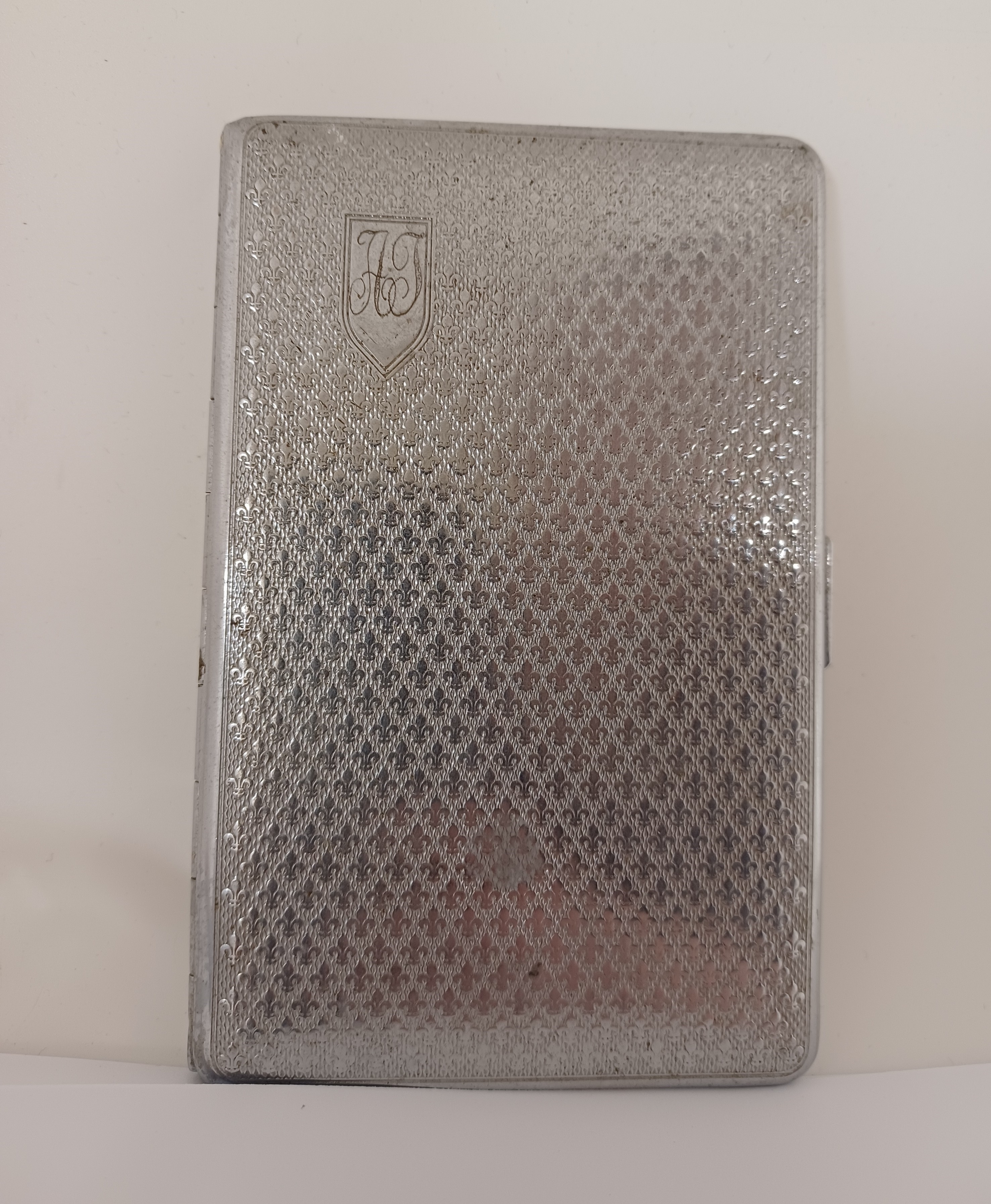 Silver cigarette case with pattern. The initials of the owner are inscribed on the front. Inside case is strip of elastic to hold the cigarettes in place.