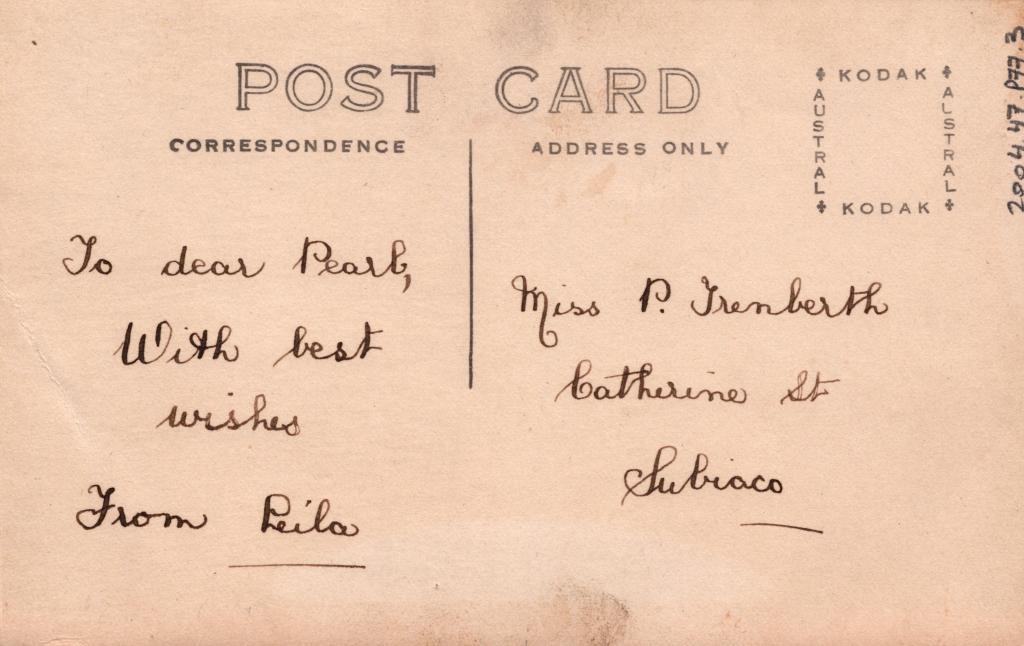 Reverse: Written in black pen 'To dear Pearl, With best wishes From Leila' and 'Miss P. Trenberth Catherine St Subiaco'