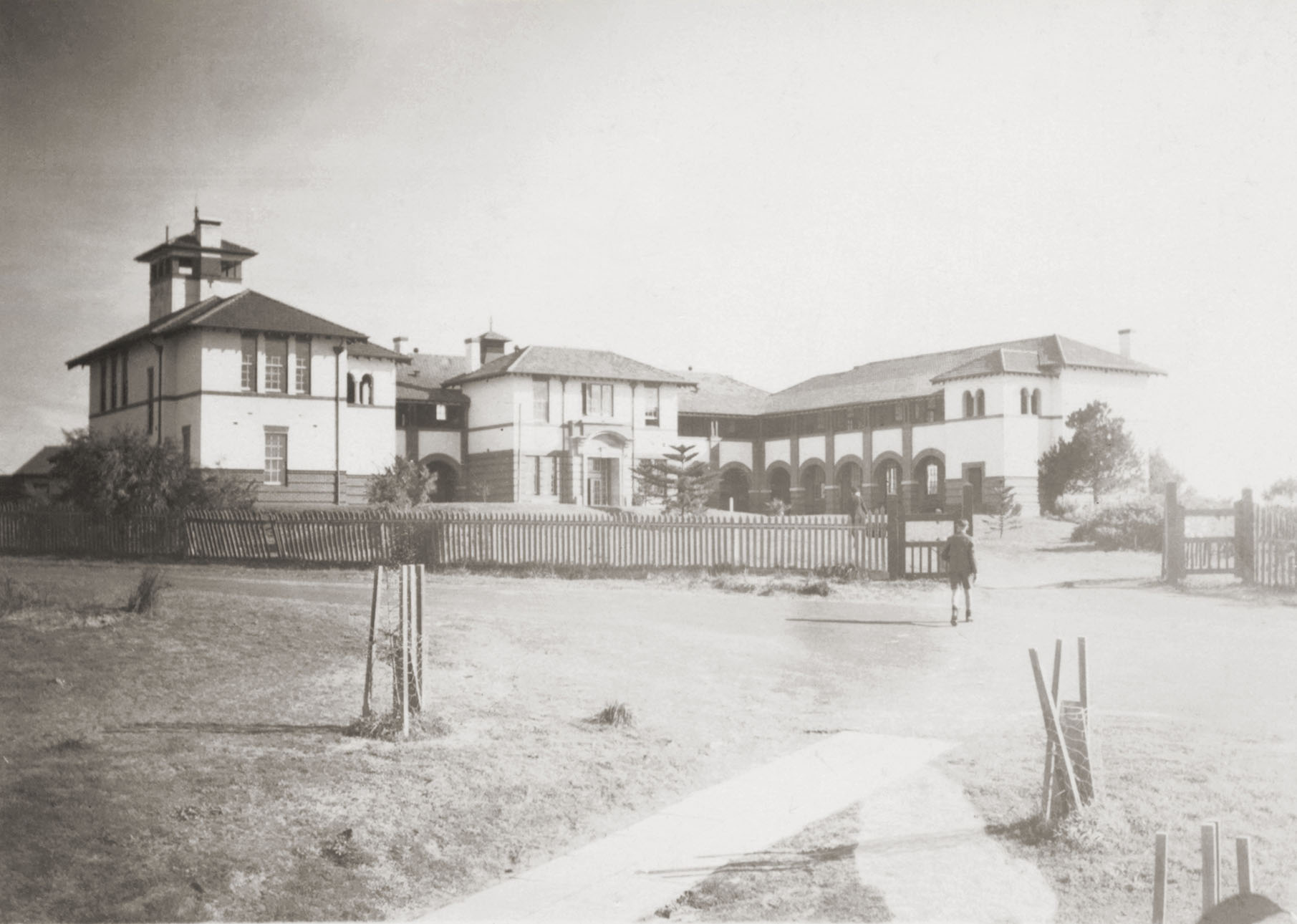 c. 1940A view of Bunbury High School from the front gate. Students walking to school.
